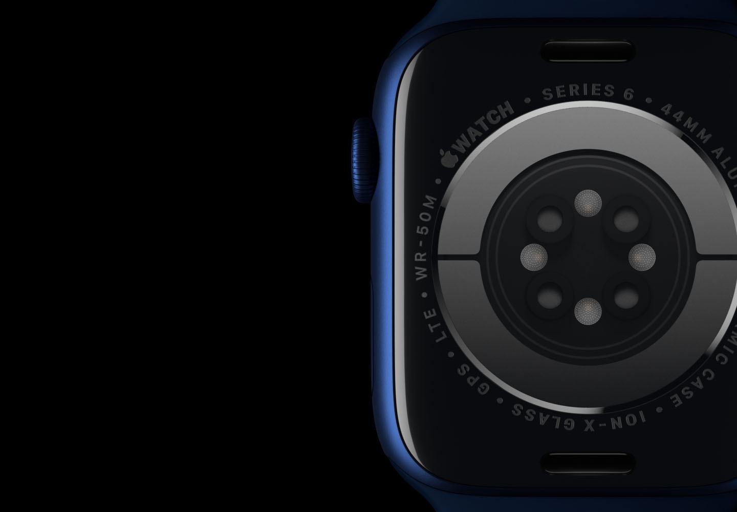 Νέος αισθητήρας, νέα δεδομέναΟ αισθητήρας κορεσμού του οξυγόνου στο αίμα βρίσκεται εγκατεστημένος στο πίσω μέρος του Apple Watch Series 6 κι αποτελείται από 4 LED και 4 φωτοδιόδους. Τα LED φωτίζουν τα αιμοφόρα αγγεία στον καρπό σας και οι φωτοδίοδοι μετράνε το ποσοστό του φωτός που αντανακλάται. Τα στοιχεία αυτά, σε συνεργασία με προηγμένους αλγόριθμους και την σχετική εφαρμογή, μπορούν να υπολογίσουν το ποσοστό του οξυγόνου που βρίσκεται στο αίμα. |