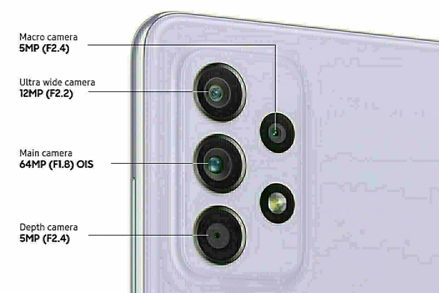 - Macro 5MP, Αισθητήρας Βάθους 5MP, Ευρυγώνιος 64MP, Υπερευρυγώνιος 12MP