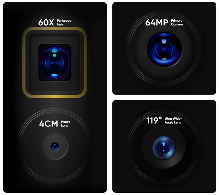 Η 64MP Quad Camera του realme X3 SuperZoom συνδυάζει 4 κάμερες σε ένα μοναδικό σύστημα: κύρια κάμερα με Samsung GW1 64MP (1/1.72”, F1.8, 6P) για ευκρίνεια και φωτεινές λήψεις, κάμερα 8MP Periscope με OIS και 5x Optical Zoom, κάμερα 8MP Ultra Wide με FOV 119° και μία 2MP Macro για απίστευτα κοντινά (από 4cm). Ο συνδυσμός τους προσφέρει εστιακή απόσταση 16mm ~ 124mm και ζουμ από 0,5x έως 60x! Η εμπρόσθια Dual In-display κάμερα φέρει αισθητήρα 32MP (Sony IMX616) + 8MP για μοναδικές selfies, ενώ ο αλγόριθμος Super Nightscape 4.0, το AI Mode, το Portrait Mode και το αποκλειστικό Starry Mode απογειώνουν τη φωτεινότητα, ακόμα και υπό το φως των αστεριών!